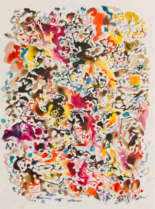For me, painting began as a way of exploring these invisible landscapes. As responses to things close and far away, tangible and intangible. Trying to imagine what explosions in the tiniest cells of your mind might look like. How our synapses might pulse and flicker with waves of magnetic energy. The chaotic nature of ink means that you have to act as a guide when painting and embrace its free flowing alchemical nature. Some of my marks have a coded semiotic quality while others are washed away with water so that only a remnant is left behind. The interplay and relationship between these shapes creates a musical mood where large swooning clouds collide with staccato tendrils.